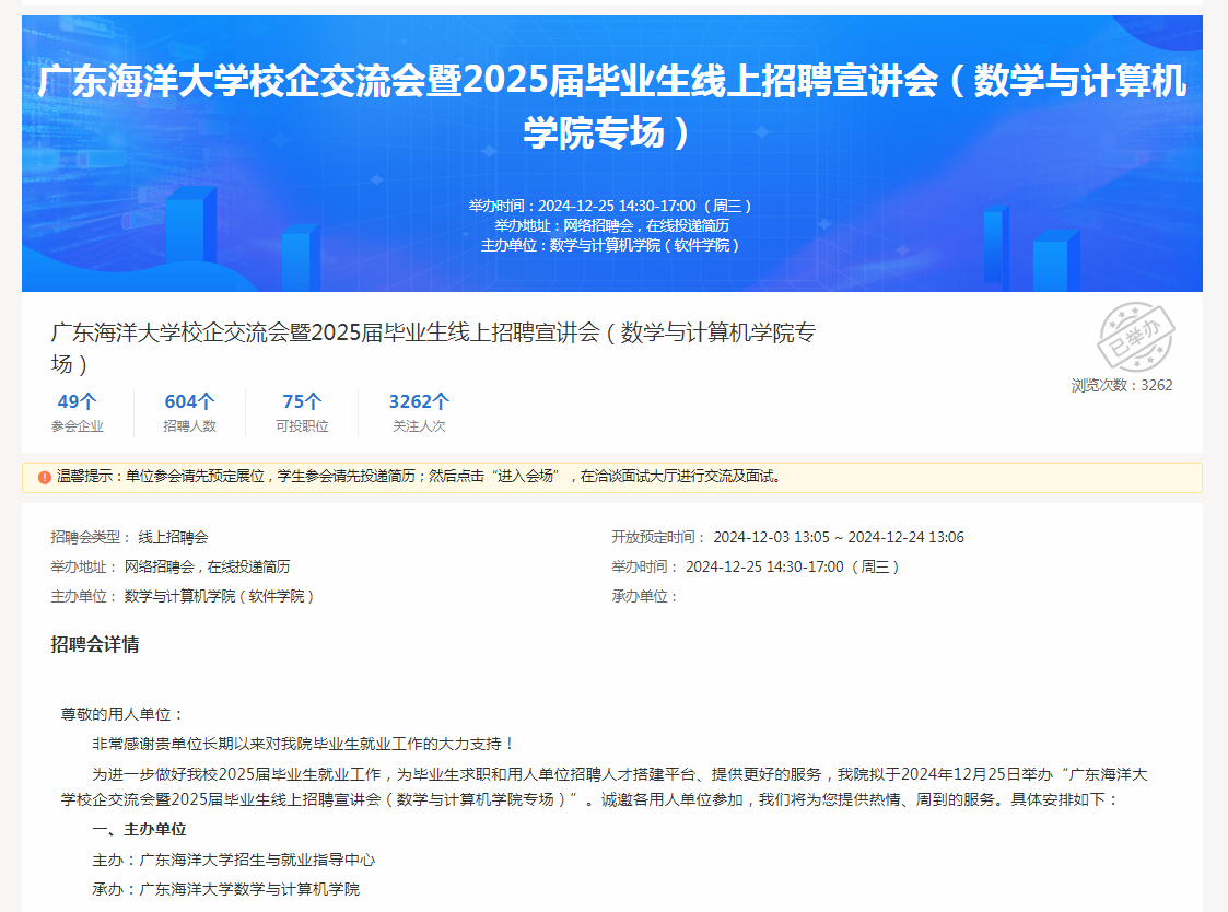 随后,北京学而思教育科技有限公司、中国联通中山市分公司、广州小马当先科技有限公司等10家企业陆续开展线上宣讲。用人单位对行业形势、用人单位特点、岗位需求等一一进行介绍。会后学院继续搭建用人单位和毕业生沟通平台,通过深入交流,让毕业生更加全面地了解用人单位、了解招聘岗位,踊跃投递求职简历。而用人单位也更充分了解到了毕业生情况,助力其更好招收到满意人才。