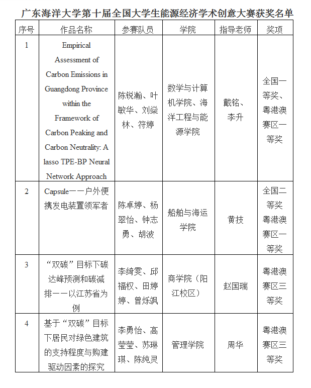 其中,来自我院数学建模团队(陈锐瀚、叶敏华、刘燊林、符婷同学)的作品《Empirical Assessment of Carbon Emissions in Guangdong Province within the Framework of Carbon Peaking and Carbon Neutrality: A lasso TPE-BP Neural Network Approach》获大学生组全国一等奖、粤港澳赛区一等奖;我院戴铭博士、李升教授荣获“优秀指导教师奖”。