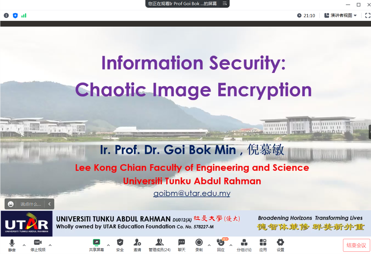 4月19日下午,应学院邀请,马来西亚拉曼大学副校长、马来西亚科学院院士Bok-Min Goi教授通过腾讯会议在线为我校师生作了题为《信息安全-混沌图像加密》的学术报告,共有30名师生聆听报告。副校长高秀梅教授致欢迎词,对Bok-Min Goi教授百忙之中为我校师生作学术报告表示感谢,并介绍了我校的基本情况、办学定位和办学特色。报告会由研究生院副院长叶国栋教授主持。