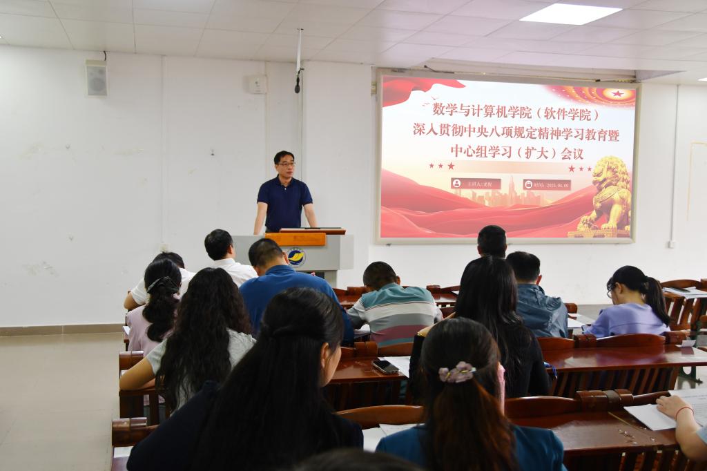 在明德楼A座103报告厅召开深入贯彻中央八项规定精神学习教育暨中心组学习(扩大)会议。学院领导、党委委员、纪委委员、各党支部书记、各教学系(部)正副主任、全体辅导员共30人参加会议。会议由学院党委书记龙俊主持。