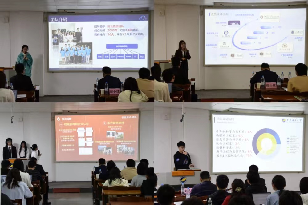 接着,学院创新创业实践基地的十一支优秀科技团队进行了总结汇报。各团队分别从科技竞赛获奖、学术科研、产品开发及技术创业等四个方面进行了总结汇报,内容涉及了物联网应用、数据挖掘、自动控制、人工智能等技术。这些成果在海洋领域、农渔业、工厂自动化及民用消费等方面得到了相关应用。现场嘉宾们对各团队的汇报提出了建议和指导并进行了打分。汇报团队的精彩演讲不时获得现场观众的阵阵掌声,各创业团队呈现的最新科技作品让现场嘉宾和同学们啧啧称赞。汇报结束后,现场的嘉宾领导对各团队的创新创业成果给予了高度评价。