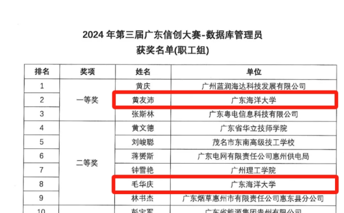 教师黄友沛、毛华庆发挥出色,最终获得数据库管理员技能竞赛(职工组)一等奖、二等奖的好成绩。