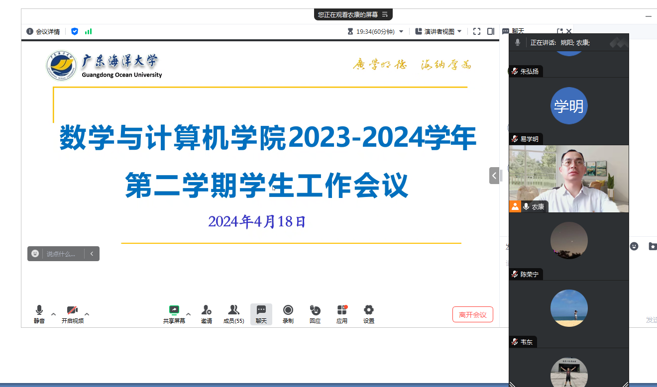2024年4月18日中午,我院通过腾讯会议室召开学生工作会议,学院全体班主任、辅导员老师参会。会议由学院正处级辅导员、党委副书记农康主持。